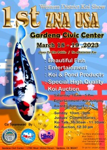 Our 47thAnnual ZNA SoCal Chapter Open Koi Show co-sponsored by the City of Gardena Department of Parks and Recreation and Hikari koi food has been designated as the 1st USA Western District Koi Show. What an honor to be the first District show in the USA The winners of our show will compete virtually with the winners of the Eastern District show at Potomac for the titles of ZNA USA Champions. These are the most prestigious awards ever presented in America. It will be held on March 18-19, 2022, at the Gardena Civic Center Complex (1700 West 162nd Street, Gardena, California 90247).